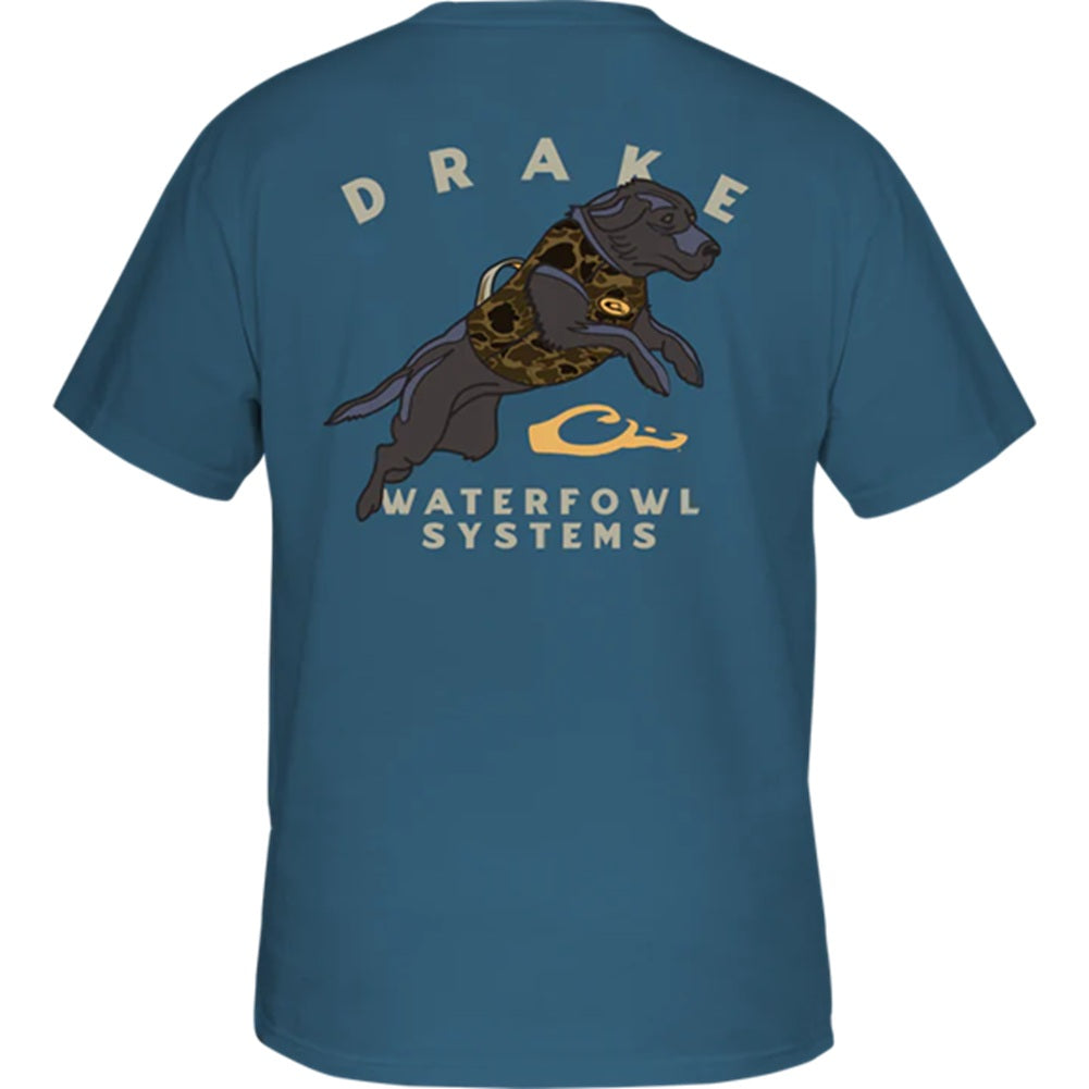 The Drake Waterfowl Graphic Tee is constructed with a 60% cotton and 40% polyester blend which supplies softness and comfort. The Drake Waterfowl Graphic Tee has a Drake logo on the front pocket and depicts a Black Lab from Drake's Retro Series of back graphic tees.