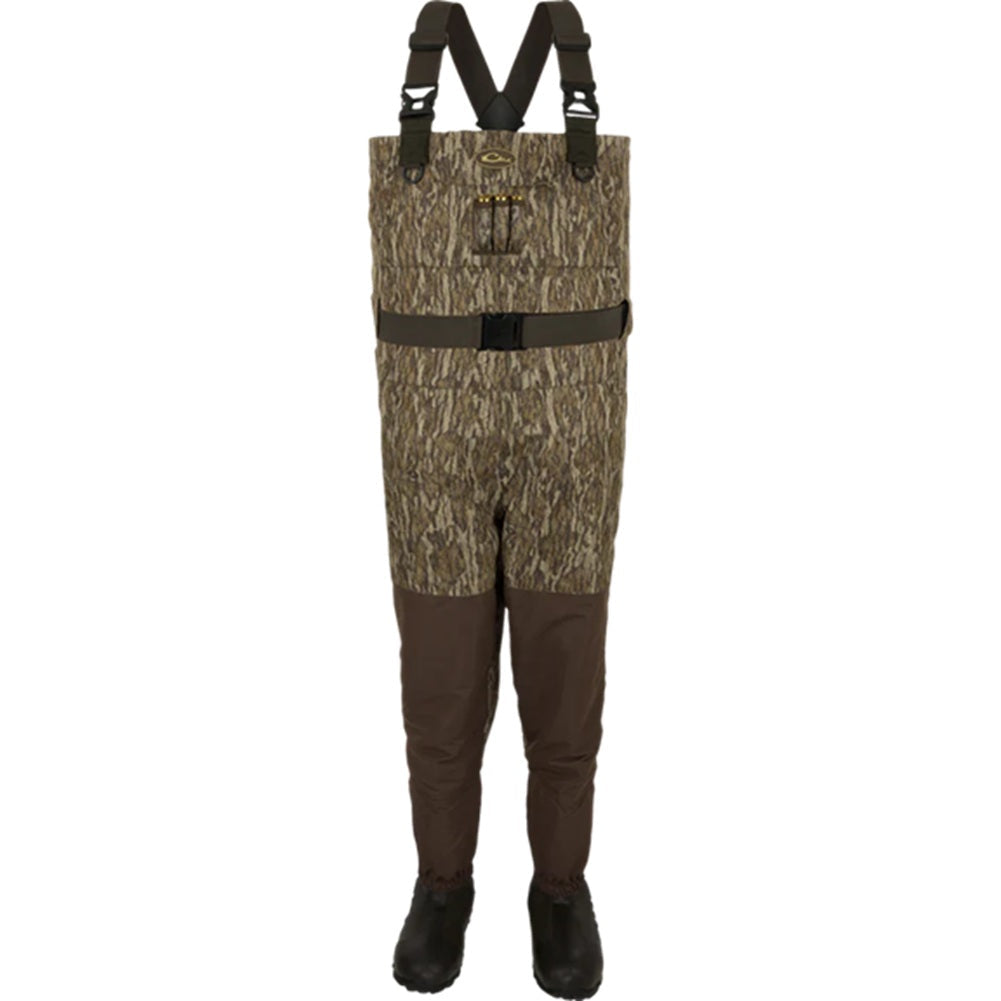 Brave cold conditions with the Drake Waterfowl Youth Insulated Guardian Elite Vanguard Breathable Wader. This waterproof and windproof 3-layer Guardian Elite fabric is treated with DWR for additional water repellency. Seams are tape-reinforced with up to 75% needle hole reduction, and HD2 material is used on areas of high wear. Enjoy superior warmth and comfort with the 125g LokDown insulation in the front and 200g LokDown insulation in the back, plus 1600g Thinsulate Buckshot Mud boots. Keep your hands snug and dry with internal handwarmer pockets and store all your gear in the front cargo pouch and inside zippered pocket.